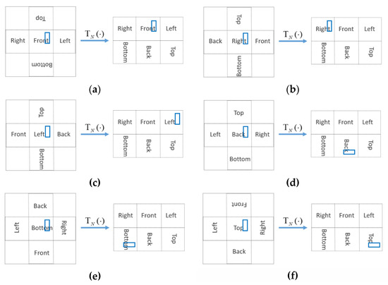 Conversion of the coordinate of the predicted bounding box of the target (blue) in different faces in the stitched image back to the coordinate in the EAC image by the TN (·). (a) Front. (b) Right. (c) Left. (d) Bac€ (e) Bottom. (f) Top.