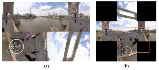 An example of a deformed and occluded target in the stitched image of EAC format of 360-degree videos. (a) An EAC image: the 274th frame of London on Tower Bridge [7]. (b) The stitched image with the center face containing the deformed target (the people in black) in (a). The search window of SiamFC is in orange. The padding pixels (black square) are similar to the occluding pixels on the target.
