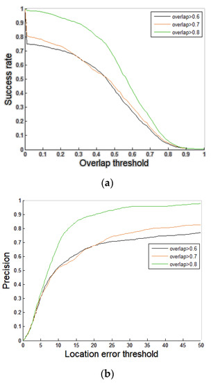 where is the overlap ratio. and are bounding boxes of the tracking result and ground truth, respectively. To improve tracking accuracy using template update, a new template that has a dissimilar appearance model with the original target template should be avoided. For example, an image patch that contains an occluded target or cluttered background is improper to use as a new template. It is suggested that the tracking result with that is greater than 0.6 is taken as high tracking accuracy in [13]. Although it will be the better update timing if the tracking result has higher accuracy (e.g., overlap ratio is 0.9), higher overlap ratio leads to infrequent update. Thus, comparisons of success plots and precision plots among the proposed tracking scheme with overlap ratios 0.6, 0.7, and 0.8 are shown in Figure 8. The success plot is generated using the overlap ratio between the predicted bounding box and the ground truth. If the overlap ratio is greater than a given threshold, the target will be taken as being tracked successfully in one frame. In the success plot, the success rate represents the ratios of successful frames at different thresholds that range between 0 and 1. The precision plot is generated using the Euclidean distance-based location error between the center of the predicted bounding box and that of the ground truth. The precision rate indicates the ratio of frames with location error that is less than a given threshold [28]. Tracking accuracy of the proposed scheme with overlap ratio 0.7 (orange curve) is similar to that of the proposed scheme with overlap ratio 0.6 (green curve). However, the proposed scheme with overlap ratio 0.8 (green curve) significantly outperforms the proposed scheme with overlap ratio 0.7 (orange curve) and that with 0.6 (black curve). Thus, a training sample will be labelled as a positive sample (i.e., high tracking accuracy) if Or is greater than 0.8 and otherwise it will be labelled as a negative sample (i.e., non-high tracking accuracy). The training dataset is adopted for analyses of conditional probability distribution and training of the projection matrix of dimensionality reduction.