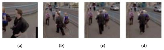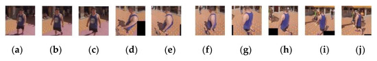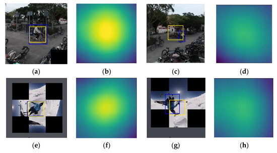 Face stitching solves the problem of content discontinuity between several adjacent faces of an EAC image. However, black padding pixels on four corners raised by face stitching lead to occlusions, similar to the one caused by the surroundings of the target (Figure 7b). In the meantime, non-uniform geometric deformation on boundaries of each face of EAC format still exists in a stitched image. However, compared with the ERP format and most variants of the CMP format, the EAC format features less non-uniform geometric deformations. Thus, this paper adopts single-view videos instead of 360-degree EAC format videos as training data of dimensionality reduction and a binary Bayes classifier for decision of update timing. Since the focus of this paper is people tracking, 21 videos containing people were selected from the OTB100 dataset [28]. These videos include Blurbody, Crossing, Crowds, Dancer, Dancer2, Girl, Gym, Human2, Human3, Human5, Human6, Human7, Human9, Jogging.1, Jogging.2, Singer1, Skating2.2, Subway, Walking, Walking2, and Woman. Videos containing people but with low tracking accuracy of SiamFC were not selected. The reason is that they cannot provide sufficient positive samples (i.e., score maps with high tracking accuracy). For selected videos, the number of training samples was approximately 10,000 while all 11 attributes (illumination variation, scale variation, occlusion, deformation, motion blur, fast motion, in-plane rotation, out-of-plane rotation, out-of-view, background clutters, low resolutions) of the OTB dataset were included. The trained SiamFC tracker was applied to each selected video. The tracker generates a score map for each video frame. A sub-image centering at the location with the highest score on the score map is cropped. Each sub-image is taken as a training sample. A training sample will have the positive label if the tracking result of the corresponding video frame has a high overlap ratio (Section 3.2). Otherwise, it will have the negative label. Accordingly, the training dataset that contains 10,407 training sample is generated. This paper adopts the overlap ratio-based tracking accuracy as follows.