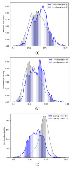 The likelihood probability distribution of a score map-based feature given high (blue)/non-high (grey) overlap ratio and clustering of training data. (a) Mean. (b) Standard deviation. (c) Fisher linear discriminant (FLD)-based feature (linear discriminant feature).