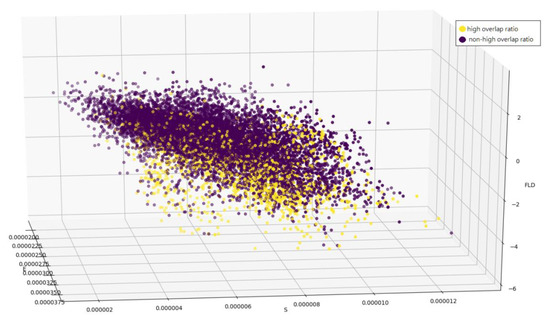 A cluster of training samples with high overlap ratio (yellow dot) and that with non-high overlap ratio (purple dot) in the 3-D feature (linear discriminant feature, mean, and standard deviation) space.