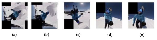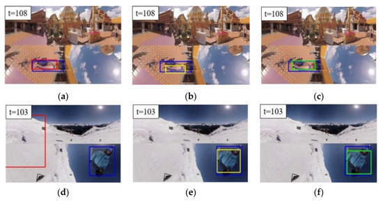 To validate the effectiveness of the proposed scheme, the training dataset of the Fisher linear discriminant and the Bayes classifier-based timing detector of the proposed scheme does not overlap with the test dataset of the proposed tracking scheme. SiamFC is trained using the VID dataset of the ILSVRC2015 dataset that consists of a variety of videos with more than one million frames [26]. Implementation details are as suggested in [12]. The training dataset of the Fisher linear discriminant and the Bayes classifier-based timing detector of the proposed scheme is generated using 21 single-view videos in [28], as described in Section 3. The test dataset consists of eight 360-degree EAC format videos with a variety of test conditions, including Spotlight (video #1) [31], London on Tower Bridge (video #2) [7], London Park Ducks and Swans (video #3) [7], Doi Suthep (video #4) [7], Amsterdam (video #5) [31], Paris-view6 (video #6) [31], Ping-Chou Half-day Tour (video #7) [30], and Skiing (video #8) [31]. Videos #1 and #8 are captured by moving cameras, and videos #2-#7 are captured by static cameras. Except video #6 that is captured at 60 fps, the frame rate of each test video is 30 fps. Videos #1 and #6 feature illumination variations. Significant geometric deformation of targets occurs in videos #4 and #8 (Figure 12). The target (i.e., a skier) has a complex motion model (e.g., in-plane rotation) in video #8. The target in video #6 is occluded for a period of time. The target moves across different faces in all test videos. Videos are downsampled before tracking, where the spatial resolution of one downsampled face of videos #1–#6 and #8 is , and that of video #7 is . The simulation environment is stated as follows. The CPU (Central Processing Unit) and GPU (Graphics Processing Unit) are i7-7700K 4.5GHz and GeForce GTX 1080 Ti, respectively. RAM is DDR4(48G). The OS (Operating System) is Ubuntu 18.04-x64. Tensorflow with Python 3.5 is adopted.