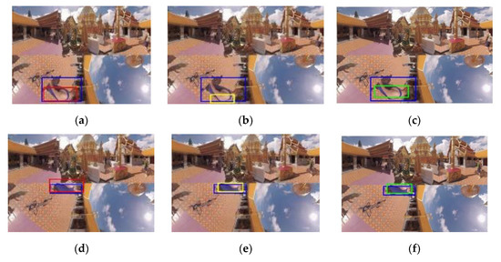 Although SiamFC + S + H heuristically selects thresholds of mean and standard deviation for each test video [23], our proposed machine learning-based method (SiamFC + S + P) still outperforms SiamFC + S + H on videos #2, #3, #4, and #6 without heuristic settings of parameters. For video #1, tracking accuracy of SiamFC + S + P is similar to that of SiamFC + S + H. For video #5, although tracking accuracy of SiamFC + S + P (the proposed scheme) is slightly lower than that of SiamFC + S + H (Tai et al.) [23], tracking results of most frames of these two trackers are similar. Moreover, there is no difference between the predicted bounding box of proposed scheme and that of Tai et al. on the last frame of Video #5 (Table 7). For videos #7 and #8, SiamFC + S + P still significantly improves tracking accuracy of SiamFC + S; even SiamFC + S + P does not outperform SiamFC + S + H on videos #7 and #8. Figure 17 and Figure 18 provide comparisons of tracking results of SiamFC + S, SiamFC + S + H (Tai et al.) [23], and SiamFC + S + P (the proposed scheme) on frames of videos #2 and #4 with combination of non-uniform geometric deformation and occlusion, and fast motion as the target moves into the boundary of a face of EAC format. The face stitching scheme indeed helps the tracker solve the problem of content discontinuity between faces, and the proposed timing detector of template update selects the right timing such that the tracker can successfully adapt to the severe change of the target’s appearance at a short notice.