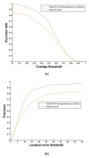 Comparisons between SiamFC + S +Timing detector of template update of LSSiam (proposed by Liang et al.) and the proposed scheme (SiamFC + S + P). Eight test videos are tested. (a) Success plots. (b) Precision plots.