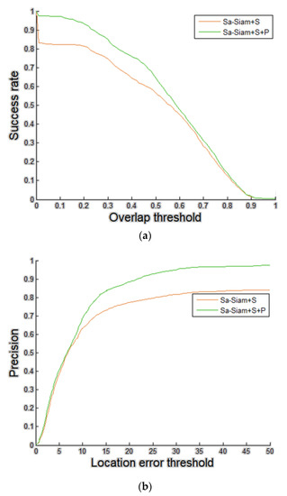 Comparisons between SA-Siam with face stitching (SA-Siam + S) and SA-Siam with face stitching and the timing detector of template update (SA-Siam + S + P). Eight test videos with 1600 frames were tested. (a) Success plots. (b) Precision plots.