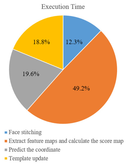 The percentage of computational time of individual components of the proposed scheme including face stitching, extraction of feature maps and calculation of the score map, prediction of the coordinate, and template update.
