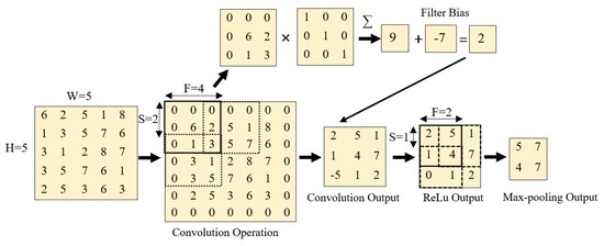 Here, represents the input local receptive field on which the convolutional operation is performed. , , and are filter weights, kernel size, and filter bias of the convolutional layer operation, respectively. In the convolutional layer, the feature vector is obtained by convolving the filter over the image pixels, and adding the pixels together. Note that the obtained feature maps vary with different convolutional kernels. The final feature vector obtained is then inputted into the activation layer (ReLU).