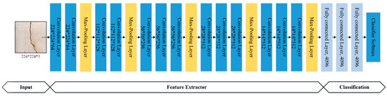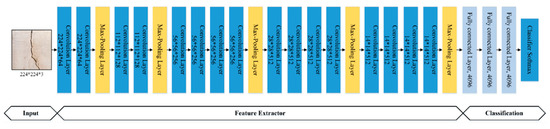 VGG-16 is an open-source CNN model proposed by [36]. This model was submitted to the ImageNet Large Scale Visual Recognition Challenge (ILSVRC-2014). The VGG-16 model comprises 16 layers (13 convolutional layers and three fully connected layers with a filter size of 3 × 3), as shown in Figure 4. The 13 convolutional layers are divided into five groups, and a max-pooling layer follows each group. The input to the VGG-16 architecture is a 224 × 224-pixel RGB image. The input passes through a stack of convolutional and max-pooling layers, and, in the end, a (7, 7, 512) feature map is received, which is then flattened into a (1, 25088) size feature vector. The flattened feature is then input to the three fully connected layers with the same configurations, and a (14,096) feature vector is obtained. The output of the fully connected layers is then inputted into the softmax layer for classification.
