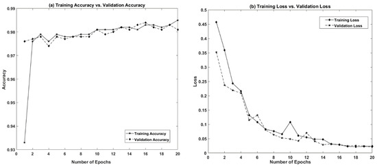 The customized CNN model performed well, and achieve an accuracy of greater than 0.95 on all datasets. However, the performance of this model decreased gradually with increasing data size. The best validation and testing scores (0.99 and 0.98, respectively) were obtained when using a 2.8 k dataset. The accuracy and loss graphs (training and validation) of the proposed model are shown in Figure 8, while a ROC curve is shown in Figure 9. There was slight divergence between the training and validation accuracy of the proposed model, which shows that the model was not subjected to overfitting. We found that the validation and testing score of the model decreased slightly with an increasing training data size. Using a 25 k dataset, training and testing scores of 0.96 and 0.95 were achieved, respectively. When the model was trained using a small amount of training data, the model converged faster at lower epochs and did not require higher epochs to achieve the best score. Moreover, the performance of this model decreased gradually and was subject to overfitting as the size of the training data increased from 8.4 k to 10.4 k, 13.4 k, 15.6 k, 20.8 k, and 25 k. The higher accuracy and stability of the proposed model on smaller dataset sizes and a lower number of epochs shows the significance of hyperparameter optimization for the model. The model skipped unwanted features at lower epochs due to the use of an activation function along with a dropout function.
