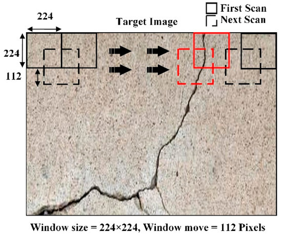 Traditional machine learning approaches for crack detection primarily comprise two steps: feature extraction, and classification. In the feature extraction step, image processing techniques are used to extract relevant crack information (features) from the images that are then evaluated by various classifiers. Many crack detection studies have been based on traditional machine learning approaches [9,10,11,12,13,14,15]. However, if the extracted features do not reflect the actual cracks, the classifier may not provide accurate results. Deep learning methods have significantly extended the versatility and robustness of conventional approaches, and have shown great performance in solving crack detection problems [15,16,17,18,19,20,21,22,23,24]. Deep convolutional neural network (CNN) models are capable of extracting relevant features from the input data through a multi-layer neural network [25]. Moreover, these models are also extendable to perform crack localization by using the sliding window approach. In the sliding window approach, a bounding box is drawn on the patch location classified as a crack by the classifier. To construct a deep learning model, the correct network structure, loss function, and an effective optimization algorithm must be selected.
