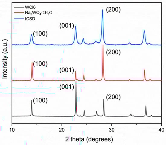XRD spectra of the standard reference pattern (ICSD 32001 from Ref. [3]) for the hexagonal polymorph of tungsten trioxide (h-) in comparison to the h-WO3 samples synthesized in this work using the and precursors.