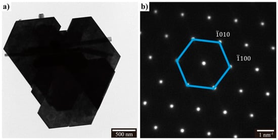 Transmission electron microscopy (TEM) micrographs of a crystallite from the h- sample can be seen in Figure 2a and consist of large flat faceted platelets with length scales on the order of hundreds of nanometers. The hexagonal features of the sample can clearly be seen by the ≈120° crystal edges. Selected area electron diffraction (SAED) patterns of the h- crystallite can be seen in Figure 2b. These patterns show the material to be highly defect free and to correspond with the [001] zone axis of the hexagonal polymorph of . These results further indicate that the large facet observed in Figure 2a corresponds with the (001) surface.