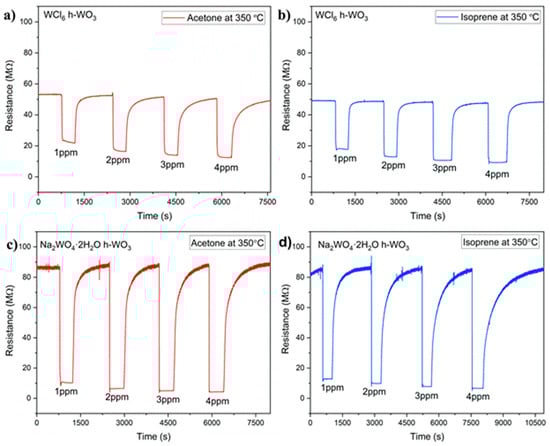 Figure 3a,b show the sensing response at 350 °C for the h- sample towards 1, 2, 3 and 4 ppm of acetone (a) and isoprene (b) gas, respectively Figure 3c,d show the sensing response at 350 °C for the h- sample towards 1, 2, 3, and 4 ppm acetone (c) and isoprene (d) gas, respectively. The response (R) of the sensors have been calculated using the following equation: