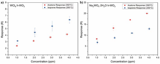 where is taken to be the baseline resistance of the sensor and was measured at 350 °C in 500 sccm OSHA grade D breathing air. is taken to be the resistance of the sensor upon exposure to the test gas. In this work, the test gasses are isoprene and acetone. Response vs. concentration plots for the h- and h- samples towards acetone and isoprene at 350 °C can be seen in Figure 4a,b, respectively. Figure 4 shows that the response of the h- consistently exhibited a higher response towards isoprene at every test concentration. This differs from the h-, which exhibited a higher response towards acetone at every test concentration.