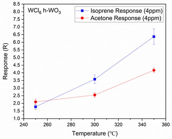To evaluate what the optimal operating temperature is for the sensing material, the response to acetone and isoprene was also evaluated at 250 and 300 °C (in addition to 350 °C) using similar acetone and isoprene concentrations. A plot of the gas sensor response, R, as a function of temperature for the h- can be seen in Figure 5.