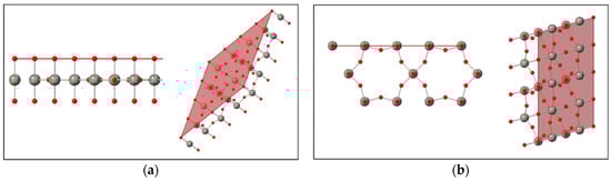 Geometrical structures of the (001) terminated surface (a) and the (100) terminated surface (b) from h-WO3. The crystal structure is ICSD 32001 from Gerand et al. Ref [3]. Red spheres indicate oxygen atoms, while green spheres indicate tungsten atoms. The viewing directions for the structures from left to right are [010], [111], [001], and [101].