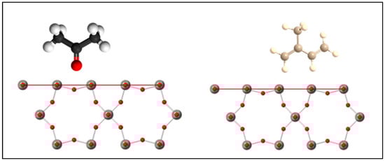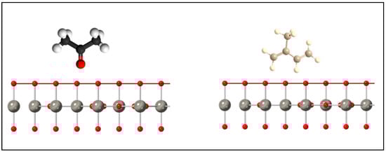 Looking at Figure 7 and Figure 8, the structure of the acetone molecule contains an electrical dipole moment pointing towards a lone oxygen atom. The (001) facet of the h- contains mostly oxygen dangling bonds. As such, the electronegative interaction between the oxygen dangling bonds and the oxygen dipole would discourage surface interactions across the large (001) faceted surface, which accounts for most of the surface area of the material. This is supported by DFT studies, which indicate that acetone adsorption onto the (001) surface of h- occurs more favorably through carbon–hydrogen bridging through the oxygen dipole on oxygen deficient surfaces where oxygen vacancies are present [24]. For the (100) facet, one can immediately see a higher density of dangling bonds as well as the presence of tungsten and oxygen dangling bonds. In particular,