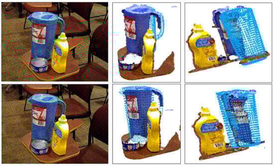 Nowadays, methods based on the conventional neural network (CNN) have been developing rapidly. Compared with traditional methods, they are more suitable for common clustering scenes in daily life. Methods based on CNN can be divided into two classes. The first class is the two-stage method, which uses CNN to regress keypoints and then computes poses using the Perspective-n-Point (PnP) algorithm []. However, methods based on keypoints can not solve symmetric object pose estimations and occluded scenes. The second class is a holistic method for regressing poses directly. Nevertheless, a big challenge for end-to-end RGB methods is that it is hard to work out the translations of objects. Previous research [,] has regressed translations directly. Figure 1 indicates the translation errors in holistic models (the quantitative experimental results are presented in Section 4.3). The predicted point cloud shifts backward compared with the ground truth. It is the large searching space of translations that makes the network hard to converge. The prior works discussed are not considered to encode the depth information appropriately. If we have the depth of objects to produce the initial translation, it is possible to obtain more accurate results by reducing the searching space for the subsequent module. To handle this problem, we consider that techniques should be adopted from the depth estimation. We tackle the depth estimation through a coarse-to-fine process, which uses a classification network to produce coarse depth and refines the depth with a regression network. In addition, we find that holistic methods [,] where Average Distance of Model Points for Symmetric Object (ADD-S) loss is used to solve symmetric objects may cause particularly difficult cases. ADD-S loss is used to train symmetric objects, which is proposed by []. It is found that ADD-S loss is not suitable for every symmetric object.