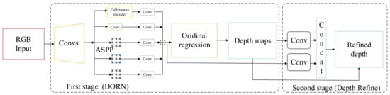 Figure 3 illustrates the details of translation estimation module. The first stage is the same as DORN []. We merely reduce the channel number to prevent time consumption and overfitting. The second stage is our depth refined module. We concatenate embedding features from the first stage and the predicted depth map to obtain the offset between the ground truth depth map and the predicted depth map. Next, we add the offset map obtained by the second stage to the depth map predicted by the first stage.