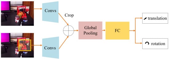 Poses from RGB inputs. Some previous methods obtain object poses by matching keypoints with known object models []. In contrast, some methods tend to use template-based techniques, which are easily affected by occlusion and varied environments [,]. In addition, two-stage methods detect keypoints and solve the pose estimation by PnP []. Suwajanakorn et al. [] extracted 3D keypoints for recovering object poses. Mousavian et al. [] obtained 3D bounding boxes on the challenging KITTI dataset by using geometric constraints of 2D-object bounding boxes. Pavlakos et al. [] used semantic keypoints to make the 6-DoF object pose reappear for both instance-based and class-based scenarios with a cluttered background. To overcome truncation scenes, Peng et al. [] proposed a Pixel-wise Voting Network (PVNet) to identify keypoints with the aid of RANSAC-based voting. However, methods based on keypoints are not capable of handling symmetric objects well, and suffer from occlusions. Recently, some CNN methods have aimed to obtain poses of objects in a single shot. Kendall et al. [] constructed a Posenet to regress the 6D pose in an end-to-end manner, which is robust to difficult lighting and motion blur. Li et al. [] proposed a pose refined framework based on RGB images, which iteratively refines the pose by matching the rendered image against the observed image. Billing et al. [] put forward a SilhoNet which predicts an intermediate silhouette representation for objects to refine the results of pose regression. We find that, for RGB methods, it is harder to figure out translations than rotations. We advise to use the estimated depth of objects to produce initial translations, which can reduce the searching space for subsequent networks. Finally, it will be easier to predict the offsets of initial translations than predicting translations directly.