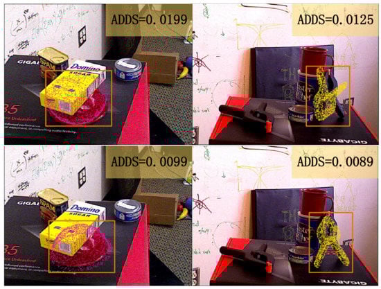 In this paper, a new loss function for symmetric objects was put forward in Section 3.4. It can be observed from 2D projection images (Figure 5) that this new loss is able to handle particularly difficult cases. To evaluate the effectiveness of the new loss, we manifest the quantitative results of the comparison with the . From Figure 5, we find the ADD-S metric is not suitable to evaluate the performance of symmetric objects. The only way to fairly evaluate the performance of symmetric object loss is to rotate symmetric objects about their symmetric axes, and then obtain the actual performance with Formula (7). In this way, the nature of symmetry is considered, although the calculation becomes more difficult than the ADD-S. Let us call our new evaluation metric ADD-R for convenience.