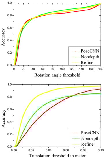 Effect of the translation estimation module. To analyze the translation estimation module discussed in Section 3.3, we conduct 6D poses experiments by using only the pose regression module. Hence, the initial translation t is zero. Compared with the result out of refined depth, the result is worse because the searching space is large. If we have the depth of objects to generate initial translations, it is easier for the network to regress offsets than predict the translations directly. Figure 6 shows the accuracy curves of rotations and translations. The performance of rotations in PoseCNN [], Nondepth, and Refine is similar. Symmetric objects are meaningless to calculate the rotation accuracy. This cannot present the performance of our symmetric loss. Furthermore, the translation estimation module can improve the performance of translations to a large extent. It is confirmed that initial translations can reduce the searching space for the network, which is able to improve the performance of the network. The main difficulty of RGB methods lies in translations. Our method enhances the performance of translations.