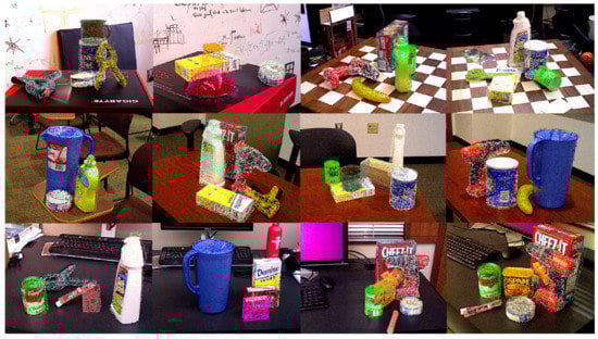 - Collet, A.; Martinez, M.; Srinivasa, S.S. The moped framework: Object recognition and pose estimation for manipulation. Int. J. Robot. Res. 2011, 30, 1284–1306. [Google Scholar] [CrossRef]