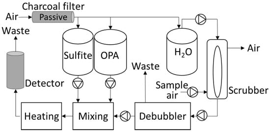 The fluorescence sensor system consists of four parts (1) scrubber sampling, (2) pumps with mixing of reagents and sample, (3) heating and (4) detector. The liquid pumps are liquid dispense pumps of the solenoid type (SMC Denmark, Horsens, Denmark) and the air pump is a diaphragm pump (Boxer GmbH, Ottobeuren, Germany). A schematic of the system is shown in Figure 1. Sample air is pulled through the scrubber with a flow of 2.4 L min−1 and the water flow to the scrubber is 4.9 mL min−1. The water flow pulling away from the scrubber is just slightly higher to avoid the build-up of water inside the scrubber. Inline after the scrubber a T-piece (debubbler) is inserted. The debubbler is oriented horizontally allowing air to escape upwards with the overflow going to waste. A small amount of water is sucked from the underside of the de-bubbler ensuring a minimum of air bubbles in the sample. The flow from the debubbler is 0.22 mL min−1. Sulfite and OPA are pumped with 0.22 mL min−1, and mixed with the sample water containing NH3 before heating to 75 °C. The temperature controller has a precision of 0.1 °C, and the heating coil has an inner diameter (i.d.) of 0.75 mm and a length of 0.5 m to ensure sufficient heating of the chemicals. Finally, the heated aqueous solution reaches the detector. The reagent and water containers are sealed and connected to a charcoal filter in order to equalize the pressure without contaminating the headspace air above the liquids.