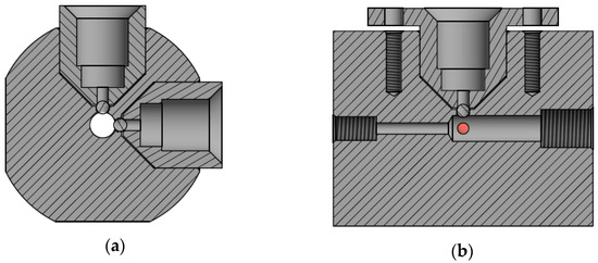 Polyether ether ketone (PEEK) flow cell with photo diode and LED installed in mounts. (a) shows an end view of a computer aided design (CAD) drawing of the flow cell. The two circles indicate the two ball lenses. (b) shows a side view of a CAD drawing of the flow cell. The two circles indicate the two ball lenses and water flow is from left to right.