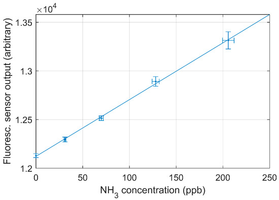 Measurements using synthetic air (NH3-free) were performed three times to obtain instrumental background. The coefficient of variation (CV) of the three measurements is 2.3% and the standard deviation of each blank measurement was similar to the blank measurements in the laboratory. Using the propagation of uncertainty with a calibration curve as Figure 3 gives an estimate of the uncertainty in the measured concentration with the sensor [24]. Using sensor output of 12,000, 25,000, 45,000 and 65,535 (i.e., approximately 0.1 ppm, 2 ppm, 6 ppm and a saturated detector) yields relative uncertainties of the measured concentration of less than 0.25%. Similar uncertainties are derived from the comparison in Figure 5 with 0.63% uncertainty for approximately 0.1 ppm and uncertainty of approximately 2 ppm, 6 ppm and saturated detector are all below 0.30%.