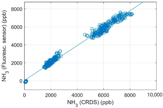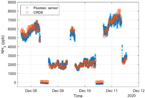 Measurements of NH3 with a CRDS analyzer from Picarro model G2103 (Picarro Inc., Santa Clara, CA, USA) was compared to NH3 measured with the fluorescence sensor presented here. This specific CRDS-instrument has been proven reliable in an agricultural environment [17].