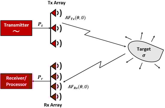 In radar systems, one or two separate antenna arrays are used for transmitting and receiving functions, as illustrated in Figure 1. If the transmitting and receiving antennas are collocated, the system is called monostatic radar. Otherwise, it is called bistatic radar. The monostatic radar transmitter and receiver antennas can be arranged to apply the VAA concept. In such radars, the received signal strength depends on the radiation pattern that is constituted from the multiplication of the radiation patterns for the transmitting and receiving antenna arrays [].
