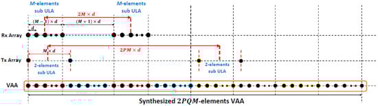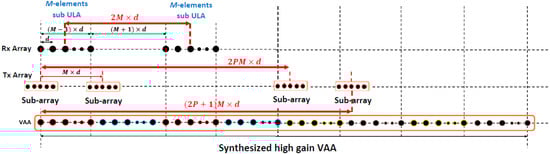 In this case, a high-gain VAA pattern is synthesized following the array design and alignment criteria shown in Figure 4. For clarification, let , , and . Each antenna element of the two transmit sub-ULAs is replaced by a subantenna array consisting of elements, with the center of each subarray being the substituted antenna element, as shown in Figure 4. The array factor of the subarray is given by: