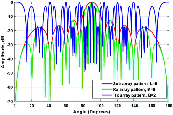 In this case, the transmitter and receiver array factors are and , respectively. The receiver array factor, is calculated by multiplying the array factor of the M-elements sub-ULA ( by the array factor of the array of the -elements subarrays ( where , and are calculated according to Equations (1) and (2), respectively.