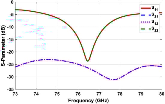 For the sake of brevity, the design steps for the transmitter subarray elements and the scattering (S) parameters of the single antenna were omitted. Figure 8 demonstrates the simulated S-parameters of the proposed transmitter antenna configuration shown in Figure 7.