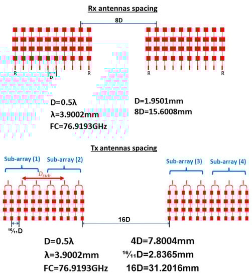 The implementation of the proposed automotive radar system was based on the integration of four AWR1243 RF chips. The AWR1243 is a single-chip standalone frequency-modulated continuous-wave (FMCW) transceiver system that implements the automotive radar sensors in the range of 76 GHz to 81 GHz. It was implemented using low-power 45 nm Texas Instruments (TI) RFCMOS technology. Each chip had three transmitters and four receivers. Therefore, when using four AWR1243 chips, we had only transmitter sources While the array configuration in Figure 4 had two -element receiver ULAs and four -element transmitter subarrays for a total of 32 transmitter antenna elements, which requires 32 transmitter sources, this imposed a great difficulty in implementing the proposed VAA system. In the next section, the solution to this problem is introduced in detail, ending with a complete operating system.
