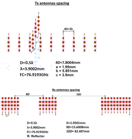 To mitigate the problem of the limited number of transmitter sources of the four AWR1243 integrated chips, the number of elements of the -element subarray could be reduced to only elements while maintaining the same array size so as not to affect the half-power beamwidth (HPBW) of the pattern. This can be achieved by increasing the element spacing to instead of and keeping the same elements excitations. Accordingly, we had 24 transmit antennas, which required 24 transmitting sources. In order to reduce this number of transmitting sources to the available 12 sources, every two neighboring elements were designed to share a common feed via a T-junction power divider, as shown in Figure 7. Each antenna element in Figure 7 consisted of four cascaded microstrip patch antennas. The dimensions of the rectangular patch antenna elements were designed to operate at 77 GHz. The shown four elements of the subarray were optimized to get good matching at the desired frequency band. Then a T-junction power divider was added to each two neighboring elements to be fed from a single source. The matching was obtained by optimizing the widths and lengths of the feeding transmission lines. The values of the antenna parameters shown in Figure 7 are listed in Table 1. The element was implemented on a RO3003 substrate with dielectric constant , tangent loss of , and thickness .