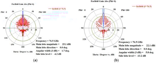 Using the proposed array distribution and the proposed antenna element shown in Figure 4 and in Figure 7, respectively, the transmitter array and receiver array can be configured as in Figure 12. While the arrays configurations of the traditional TI’ LFMCW radar introduced in [,] are shown in Figure 13. Figure 14a,b illustrate the radiation patterns of the transmitter and receiver arrays of the proposed VAA, respectively, while Figure 14c,d show the patterns of the transmitter and receiver arrays of the TI’ LFMCW radar, respectively.