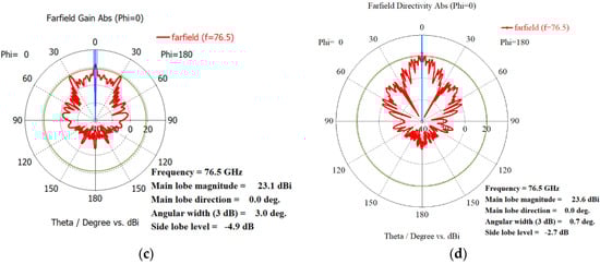 Polar radiation patterns of: (a) transmitter array of the proposed VAA, (b) receiver array of the proposed VAA, (c) transmitter array of the traditional TI’ LFMCW radar, and (d) receiver array of the traditional TI’ LFMCW radar.