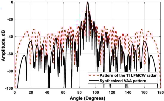 A comparison between the synthesized VAA pattern and the pattern of the traditional TI’ LFMCW radar is shown in Figure 15. It is clear that the two patterns had the same HPBW = , while the proposed VAA pattern had a faster-decaying SLL than that of the TI’ LFMCW pattern. The synthesized VAA had and while the TI’ LFMCW array had and . The gain of the proposed VAA approached , while that of the TI’ LFMCW approached . The area of the TI’ LFMCW approached , while the area of the proposed VAA approached , which saved the required area by . It is clear that the proposed VAA configuration was superior to the TI’ LFMCW configuration in terms of the implementation area, SLL, and realized array gain. It is worth noting that the saved area could be translated into achieving multiples of the array gain, and thus increased the radar detection range.