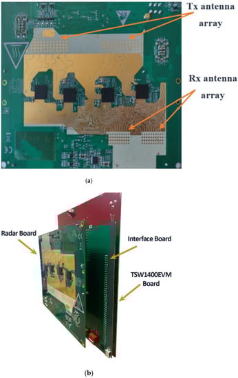 77 GHz radar system: (a) fabricated VAA radar board; (b) fabricated VAA radar board connected to the TI’ TSW1400EVM board via an interface board.