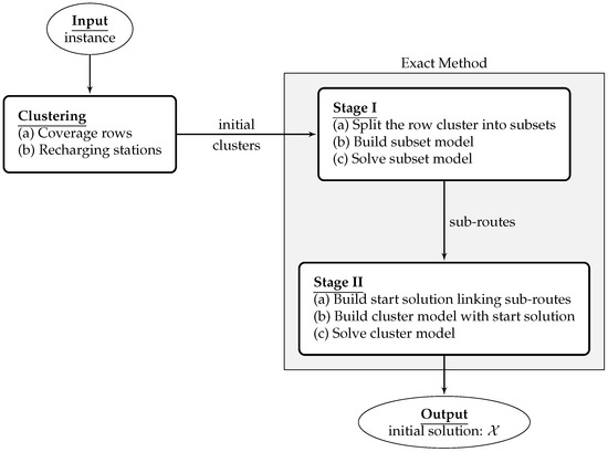 More generally, the initial solution is built by the clustering process, splitting the original problem into clusters and then applying the exact method to find routes in each one of such clusters. In Figure 2, the scheme to generate the initial solution is presented. First, the clustering procedures are applied to assign the UAVs, the coverage rows, and the recharging stations to the clusters, and then a two-stage exact method is applied in the routing phase.