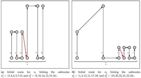 Next, the other subroutes in the cluster are selected and integrated into the route being built, following its proximity (lines 5–13). The subroute selection is performed by line 6, considering the distance between the output vertex on the last covered row in route and the first vertex visited by the vehicle on the remaining subroutes. This step for the Figure 5b example checks the distance from vertex 8, the output vertex, to vertex 9, which is the input vertex in the subroute. In this case, the battery charge of the UAV to depart from the output vertex in must be sufficient to reach the input vertex of the sub-route to link them directly (i.e., red rows in Figure 5) or by a path passing through recharging stations, if necessary. The function LinkSubRouteOnRoute evaluates the vehicle capacity and returns the appropriate links to connect the subroute in the route . If this connection is infeasible, the built route is deleted, and the link process continues to the next cluster (lines 9–12). For the clusters with empty routes, the exact method in Stage II builds the MILP model without an initial starting point.