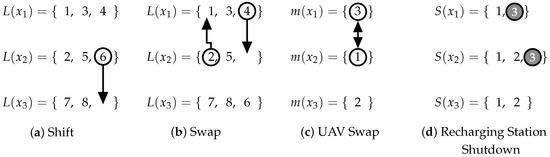 In this work, we implemented four neighborhood functions, as shown in Figure 6. The Shift function moves a coverage row to other row set , as shown in Figure 6a; the coverage row 6 from is moved to . The Swap function exchanges rows among routes, reallocating a row to and a row to . In Figure 6b, rows 2 and 4 change clusters. The row 2 from is transferred to , and row 4 from is transferred to . UAV Swap was designed to interchange the UAV models between two routes, transferring a vehicle of model from route to route , while the current UAV of model assigned to is transferred to route . In Figure 6c, the UAV of model 3 from route is transferred to the route , and the UAV of the model 1 in is transferred to . The Recharging Station Shutdown removes a recharging station from all routes that use this station. In Figure 6d, recharging station 3 is removed from routes and .