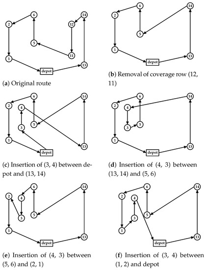 - Krushinsky, D.; Van Woensel, T. An approach to the asymmetric multi-depot capacitated arc routing problem. Eur. J. Oper. Res. 2015, 244, 100–109. [Google Scholar] [CrossRef]