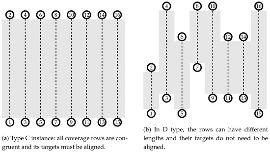 The number of the row subsets () and their quantity of rows () are set up in the initialization of Algorithm 3 (line 1). Next, the coverage row set is divided into subsets, and each subset is assigned at most coverage rows, considering the vertex positions and the proximity among them (lines 2–17). The rows in are sorted from the leftmost row to the rightmost (line 5). In the example shown in Figure 4b, the sorting for splitting returns the sequence . Afterward, the first row of this sequence is assigned to the current subset (line 7). This step for results in .