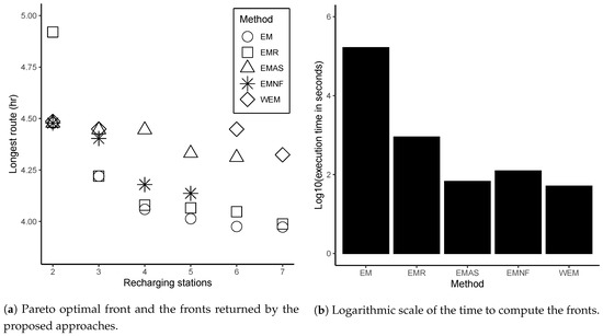 The decrease in the number of calls of the exact method in EMAS, EMNF, and WEM was achieved by designing a heuristic to route and evaluating each change performed by their neighborhood functions. The strategy adopted in EMNF and EMAS to mitigate the trade-off between execution time and the quality of the computed fronts was a wise application of the exact method to improve some solutions. The EMAS calls the exact method into the neighborhood functions only to the best solution returned by the routing heuristic. Conversely, EMNF adds an intraroute operator on its VND that uses the exact method to improve each route of the current solution separately.