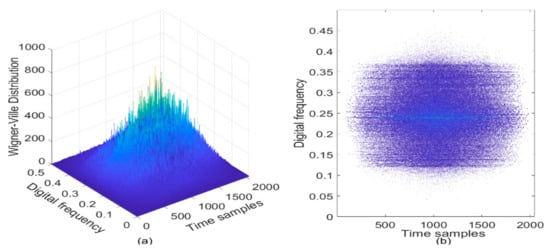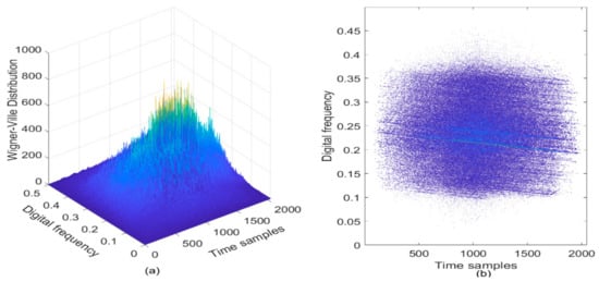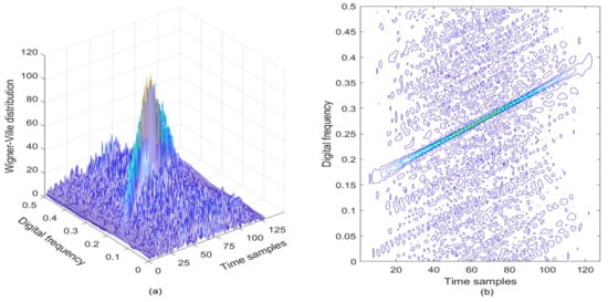As a result, if a signal contains more than one component in the TF plane, its WVD suffers from spurious features containing cross-terms that occur halfway between each pair of auto-terms. As an example, the LFM signal in the presence of AWGN is analyzed, where the SNR is set to be 3 dB. The WVD of the noisy LFM signal is provided in Figure 1a, and correspondingly, the contour of the computed WVD is presented in Figure 1b. From Figure 1, it can observe the TF peaks representing the noisy LFM signal, but there exist serious cross-terms in the TF plane where we expect no energy at all. The presence of the cross-terms of the analyzed signal in the TF plane does not possess any physical meaning, which makes proper signal interpretation very difficult; this is the main drawback of the WVD approach [30,31].