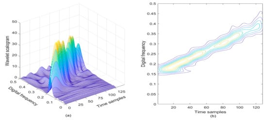 In Figure 2a, the wavelet scalogram of the noisy LFM signal is provided, and correspondingly, the contour of the computed wavelet scalogram is presented in Figure 2b. From Figure 2, the TF energy peaks can be observed in the TF plane in the absence of cross-terms, which can almost represent the frequency modulation law of the LFM signal with the AWGN; but from Figure 2b, the wavelet scalogram shows very poor TF localization property in the TF plane, which shows unsatisfactory TF resolution in the LFM signal detection.